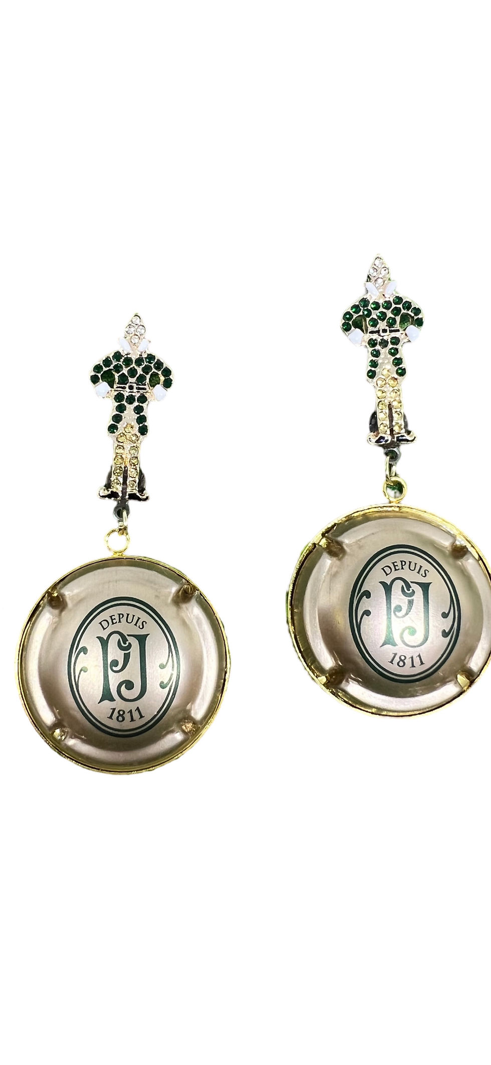 • Upcycled Champagne Centerpiece: The focal point is an authentic Pommery "Royal Blue Sky" champagne cap, instantly recognizable by its striking, vibrant royal blue color. The cap carries the original "POMMERY" and "REIMS" markings, celebrating the prestigious Champagne House .